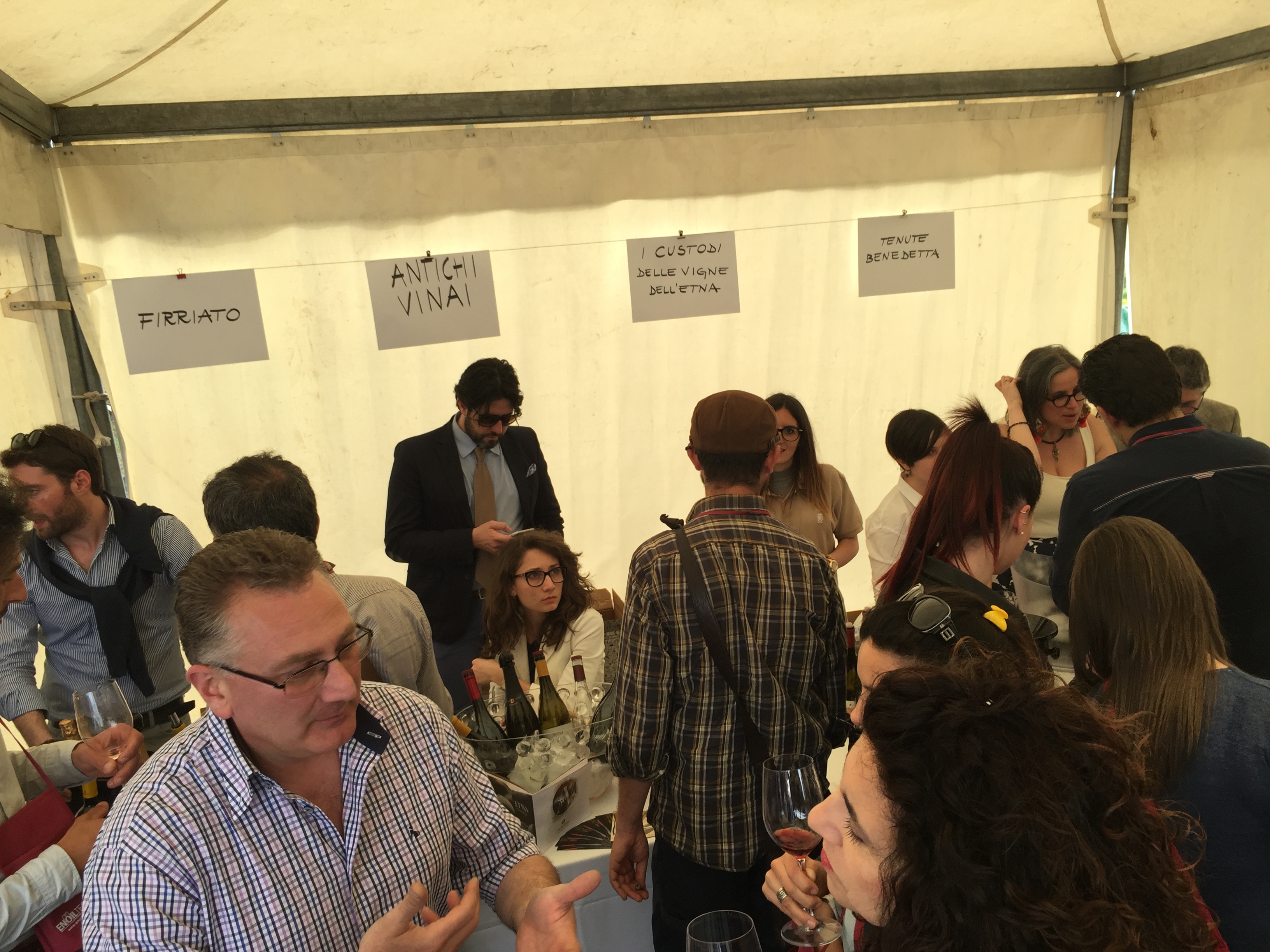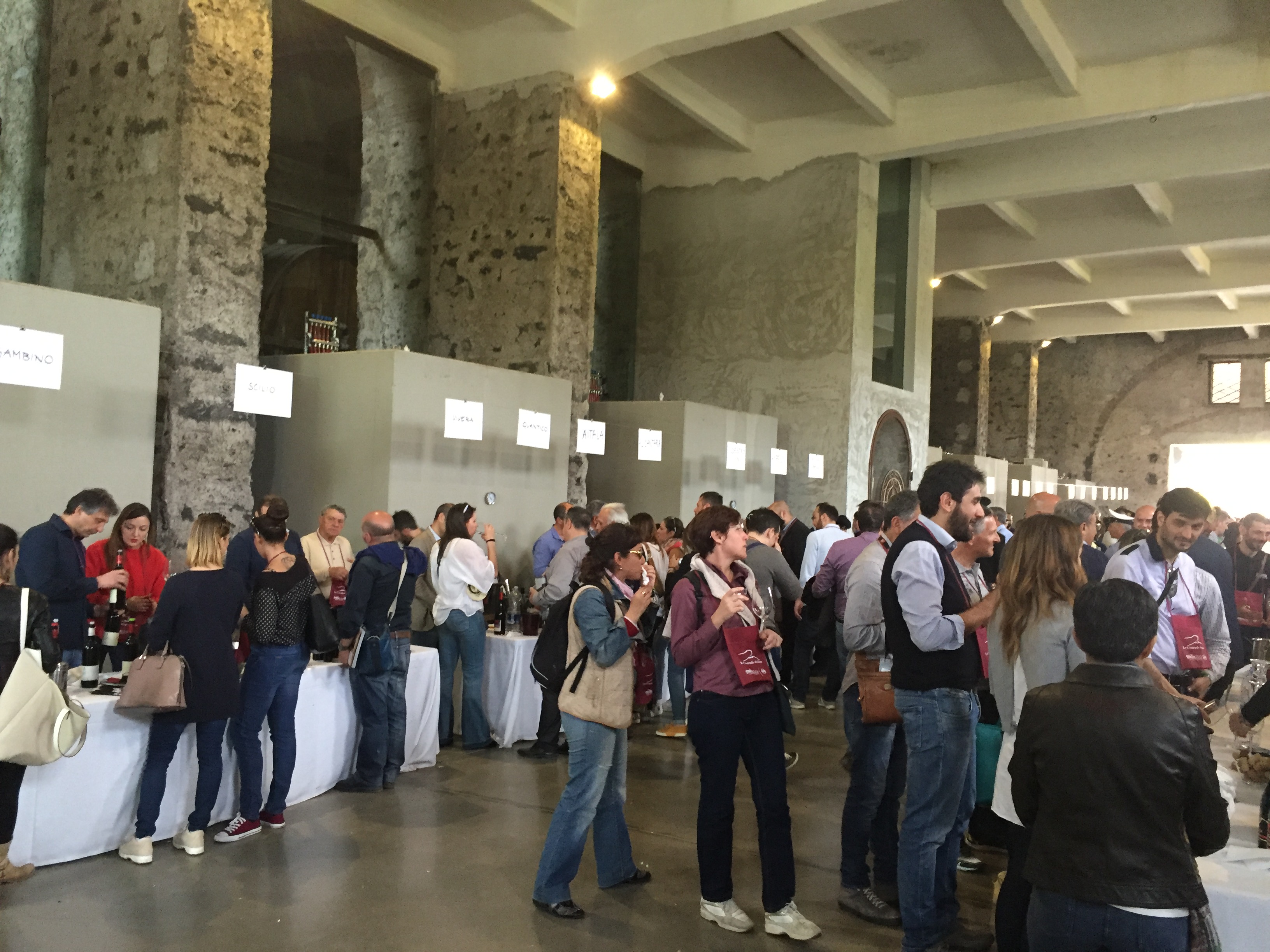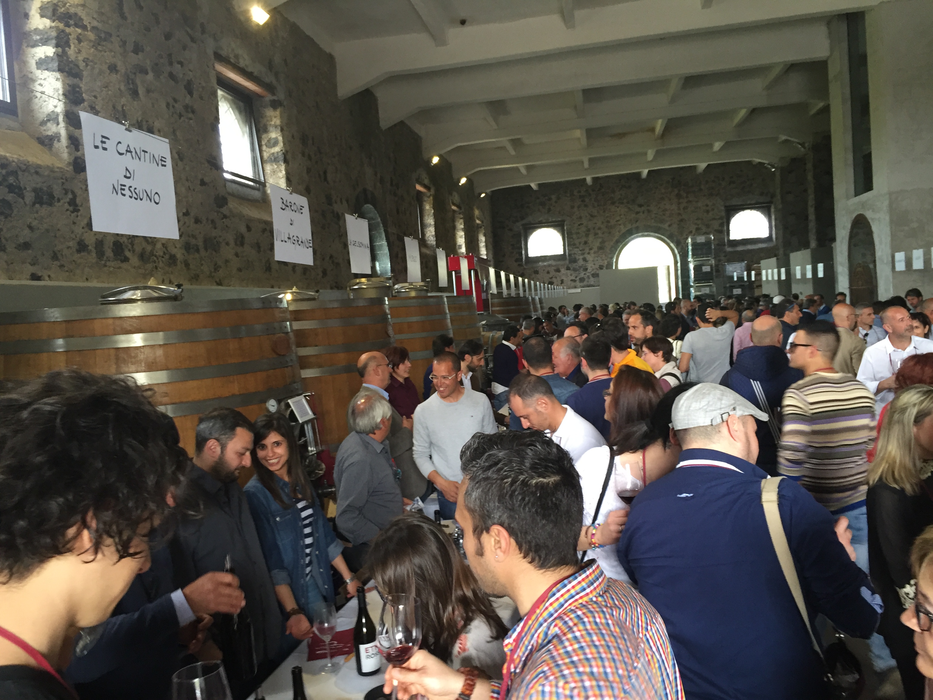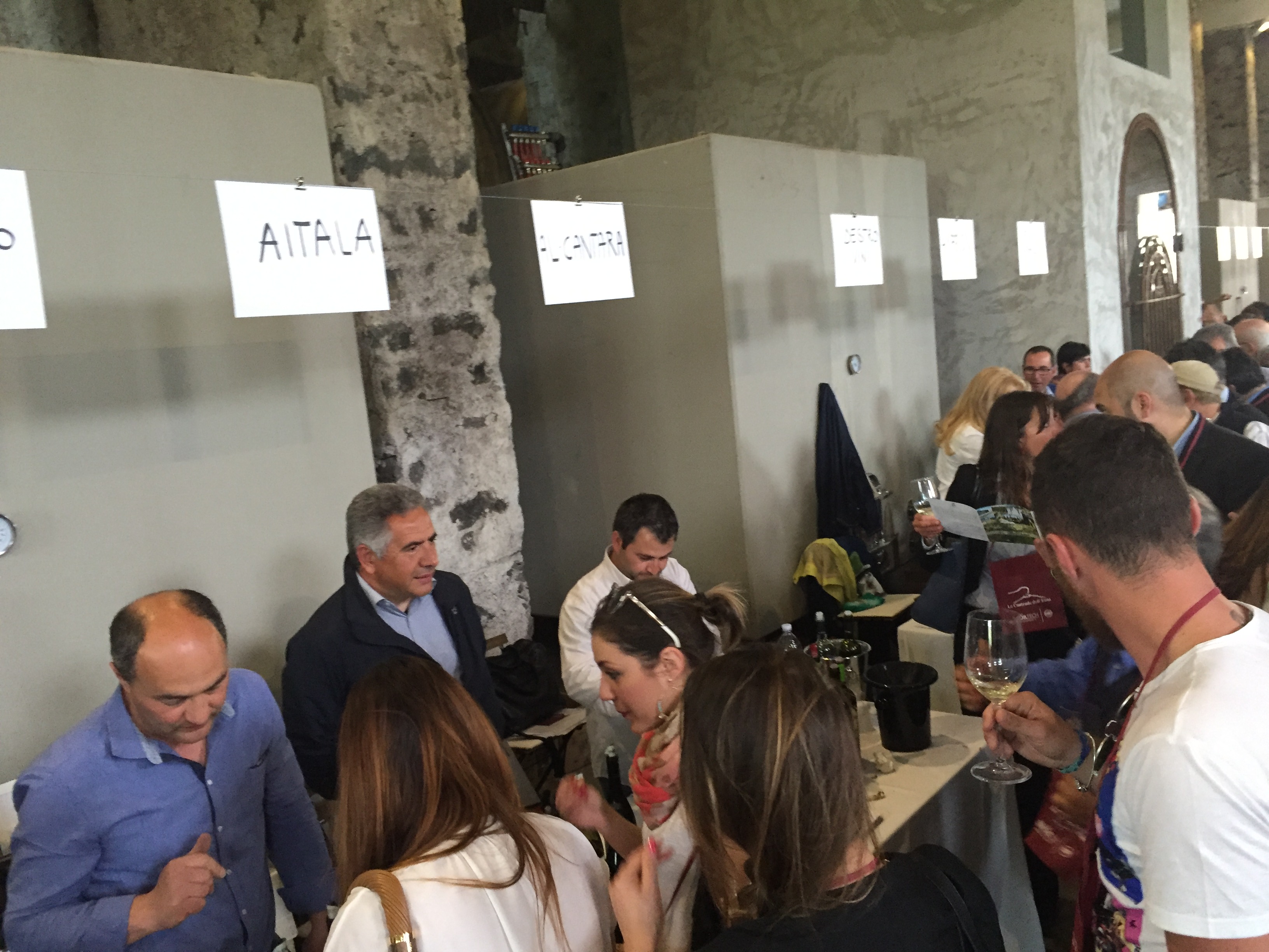 Quest’anno all’evento era presente con un proprio stand pure l’Enoteca Regionale Sicilia Orientale, che ha sede nella stessa Castiglione e raggruppa diversi comuni del catanese e messinese, due Gal, diversi operatori turistici e numerose aziende vitivinicole. L’Etna si conferma un territorio dalle grandi potenzialità, che continua ad attirare anche nuovi imprenditori del settore vitivinicolo che qui vogliono investire. L’evento creato da Andrea Franchetti , l’imprenditore toscano che ha investito sul vulcano e produce vini esportati in tutto il mondo con la sua azienda “ Passopisciaro” quest’anno è giunto alla nona edizione. Rossi, bianchi, rosati, spumanti, tutti i vini in “passerella”, sia le ultime produzioni che degli anni precedenti. Un evento atteso e condiviso da tutte le aziende del territorio, diventando di conseguenza un prezioso strumento di promozione di tutte le aziende partecipanti, dove anche le piccole aziende trovano qui l’opportunità di farsi conoscere, dove aziende che producono milioni di bottiglie ed esportano in tutto il mondo, si ritrovano accanto a piccoli produttori, con produzioni di nicchia e numeri limitati di bottiglie commercializzate. Una formula che funziona, almeno finora, ma dove secondo alcuni di fatto è diventato solo una passerella di tendenza, dove produttori, giornalisti, addetti ai lavori si ritrovano semplicemente perché non si può essere assenti, ma ben venga l’evento che invece sta innescando nuovi meccanismi, nuovi input, dove poi all’evento ufficiale fanno da corollario altre iniziative, intraprese dalle stesse aziende vitivinicole o da ristoratori della zona. Contrade dell’Etna insomma diventa una kermesse che aiuta l’enoturismo sull’Etna e sul territorio di Castiglione in particolare, dove ricordiamo solo sul territorio comunale castiglionese sono censiti oltre 50 aziende vitivinicole. Ma ecco l’elenco ufficiale delle aziende di Contrade dell’Etna 2016 (dopo l’elenco alcune foto della giornata).