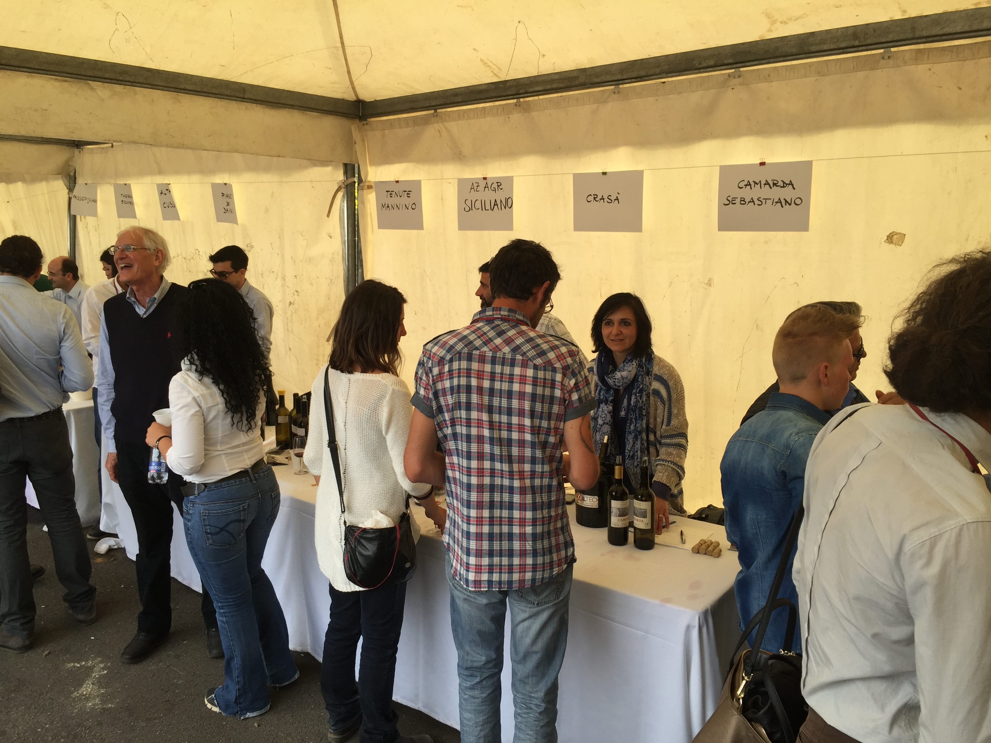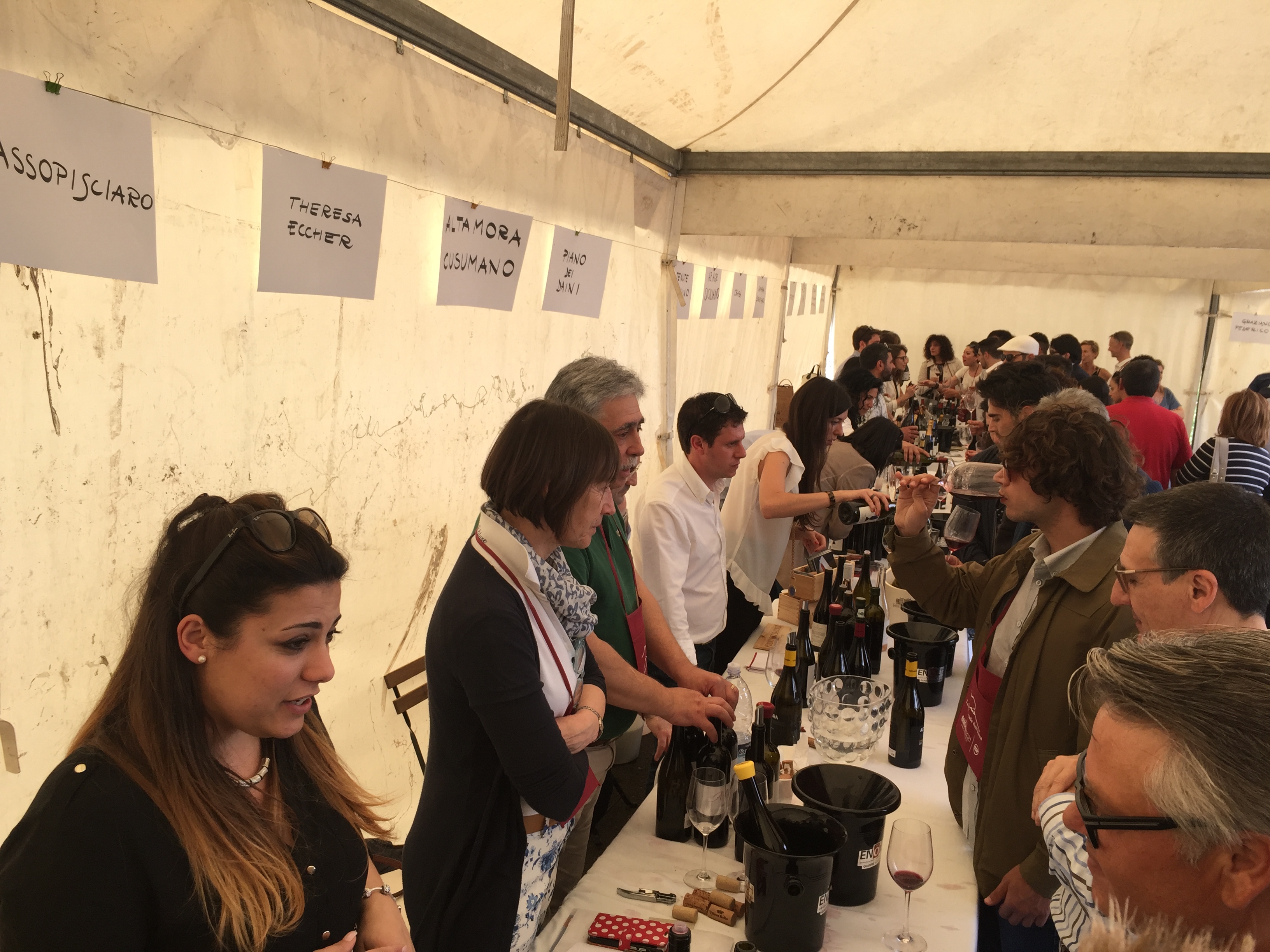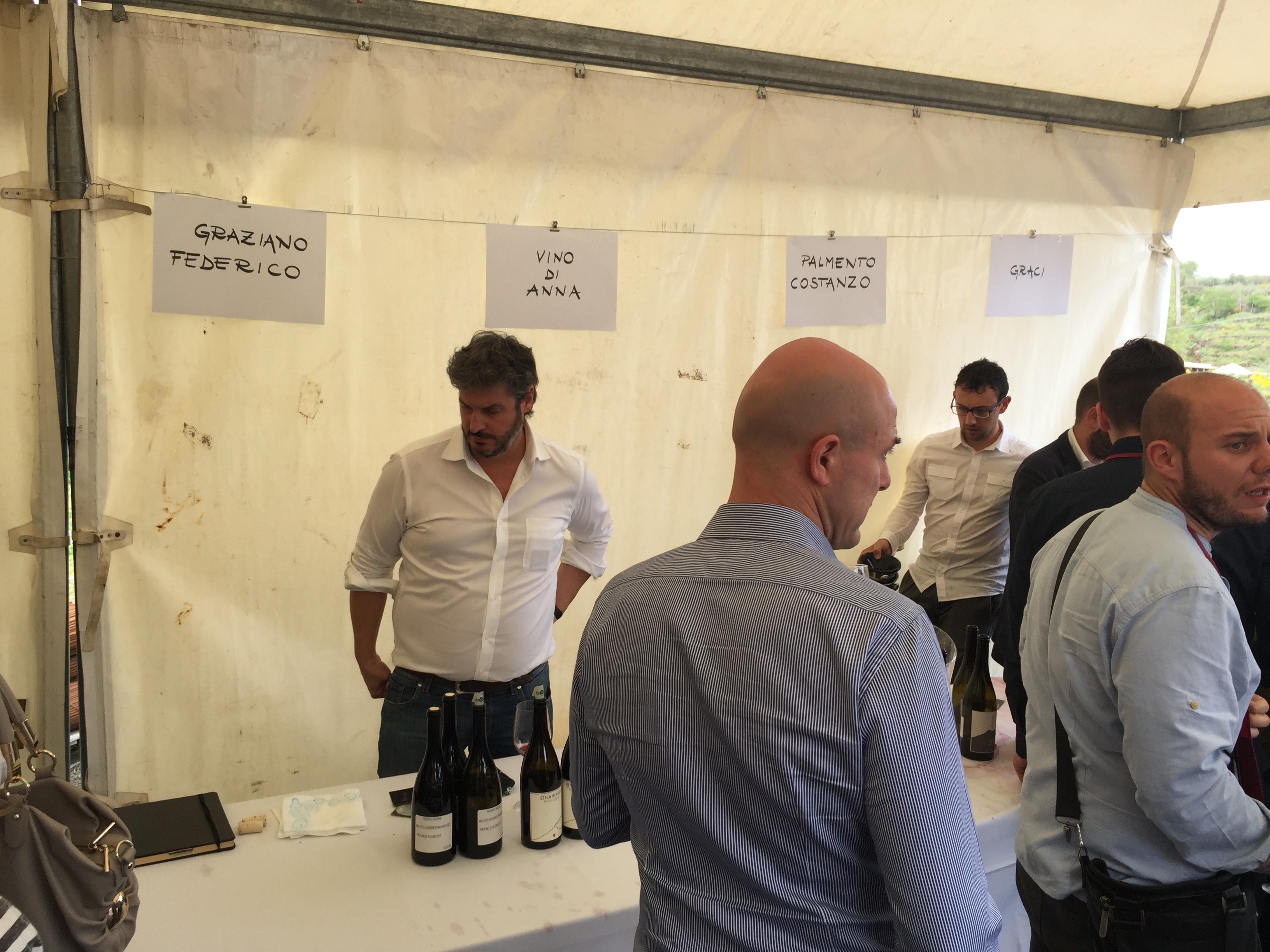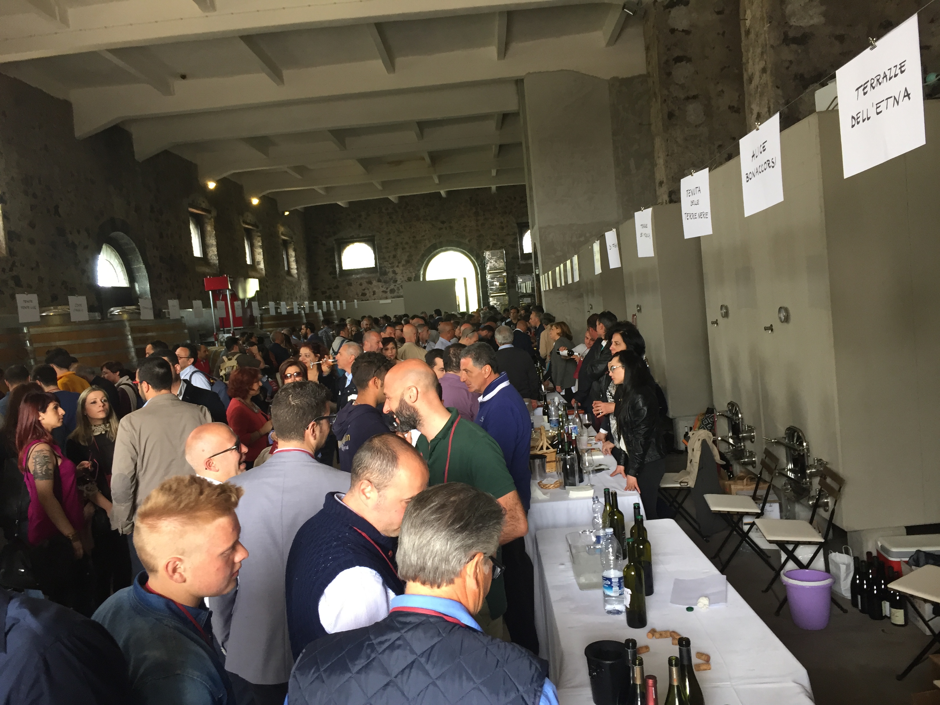 Quest’anno all’evento era presente con un proprio stand pure l’Enoteca Regionale Sicilia Orientale, che ha sede nella stessa Castiglione e raggruppa diversi comuni del catanese e messinese, due Gal, diversi operatori turistici e numerose aziende vitivinicole. L’Etna si conferma un territorio dalle grandi potenzialità, che continua ad attirare anche nuovi imprenditori del settore vitivinicolo che qui vogliono investire. L’evento creato da Andrea Franchetti , l’imprenditore toscano che ha investito sul vulcano e produce vini esportati in tutto il mondo con la sua azienda “ Passopisciaro” quest’anno è giunto alla nona edizione. Rossi, bianchi, rosati, spumanti, tutti i vini in “passerella”, sia le ultime produzioni che degli anni precedenti. Un evento atteso e condiviso da tutte le aziende del territorio, diventando di conseguenza un prezioso strumento di promozione di tutte le aziende partecipanti, dove anche le piccole aziende trovano qui l’opportunità di farsi conoscere, dove aziende che producono milioni di bottiglie ed esportano in tutto il mondo, si ritrovano accanto a piccoli produttori, con produzioni di nicchia e numeri limitati di bottiglie commercializzate. Una formula che funziona, almeno finora, ma dove secondo alcuni di fatto è diventato solo una passerella di tendenza, dove produttori, giornalisti, addetti ai lavori si ritrovano semplicemente perché non si può essere assenti, ma ben venga l’evento che invece sta innescando nuovi meccanismi, nuovi input, dove poi all’evento ufficiale fanno da corollario altre iniziative, intraprese dalle stesse aziende vitivinicole o da ristoratori della zona. Contrade dell’Etna insomma diventa una kermesse che aiuta l’enoturismo sull’Etna e sul territorio di Castiglione in particolare, dove ricordiamo solo sul territorio comunale castiglionese sono censiti oltre 50 aziende vitivinicole. Ma ecco l’elenco ufficiale delle aziende di Contrade dell’Etna 2016 (dopo l’elenco alcune foto della giornata).