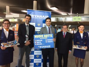 Alla presentazione di oggi all’aeroporto di Catania ha partecipato il sindaco del capoluogo etneo, Enzo Bianco. Giuseppe Belladone, Sales and Marketing Executive Ryanair per l’Italia ha affermato:“Siamo lieti di celebrare l’inizio dell’operativo invernale da Catania, che include 5 nuove rotte per Berlino, Malta, Milano Malpensa, Perugia e Trieste, un nuovo collegamento invernale per Pisa e voli aggiuntivi per Eindhoven. Inoltre aggiungeremo alla base di Catania un nuovo aeromobile (3 in totale), portando il nostro investimento a oltre 300 milioni di dollari USA, che ci consentirà di trasportare 2,6 milioni di clienti per anno e di creare 2.000* posti di lavoro presso l’Aeroporto di Catania, data la crescita delle nostre operazioni del 56%. Per celebrare l’inizio del’operativo invernale da Catania e le nuove rotte per Berlino, Malta, Milano Malpensa, Perugia e Trieste, stiamo mettendo in vendita i posti con tariffe a partire da € 9,99 per viaggi gennaio e febbraio, e disponibili fino alla mezzanotte di martedì 8 novembre. Invitiamo i nostri passeggeri a collegarsi al sito www.ryanair.com per approfittare di questa incredibile tariffa prima che sia completamente esaurita.”
