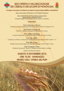 Un Convegno su “Riscoperta e valorizzazione dei cereali e dei legumi di montagna”, si terrà nella Sala Conferenze del Museo dell’Opera dei Pupi , sito in Largo San Giuliano, al bivio per Santa Domenica Vittoria, alle ore 10.30 di domani, sabato 5 novembre 2016. L’obiettivo è riaccendere i riflettori su tradizioni e patrimonio che caratterizzavano l’agricoltura tra i Nebrodi e l’Alcantara un tempo con una variegata produzione. Terreni abbandonati ed incolti, spesso, oggi invece evidenziano come non esiste più la figura del contadino che riusciva a far vivere la propria famiglia col raccolto dei propri campi, del proprio frutteto. Ne tanto meno in queste zone l’agricoltura è riuscita a stare al passo con i tempi, spesso perchè in presenza anche di piccoli appezzamenti e micro aziende agricole. A parte qualche raro caso, ed i vigneti più diffusamente, qui non si producono più molti legumi e cereali che un tempo caratterizzavano i terreni. Un ritorno all’agricoltura a Km zero, ovvero prodotta nel podere di casa o nel terreno di famiglia? chissà, il convegno vuole riaprire l’attenzione in tale direzione, dove certamente si dovrebbero pure cambiare abitudini alimentari e stili di vita.