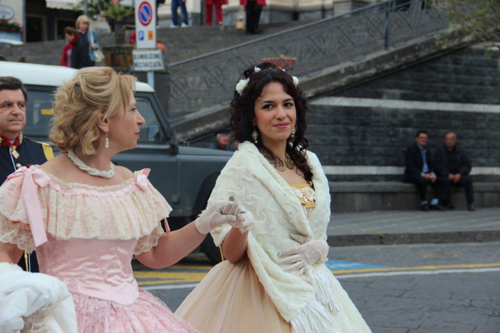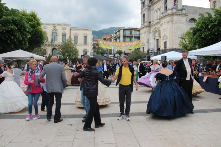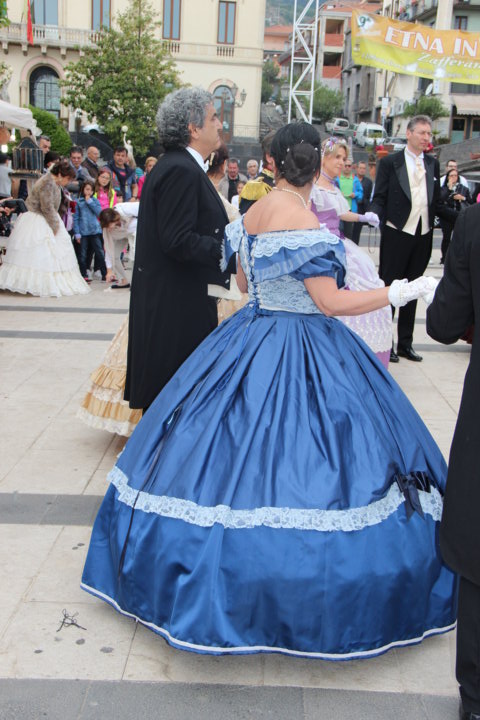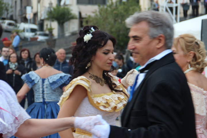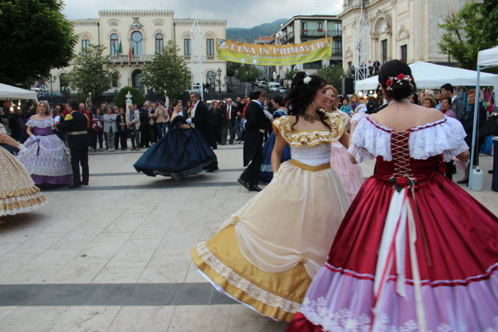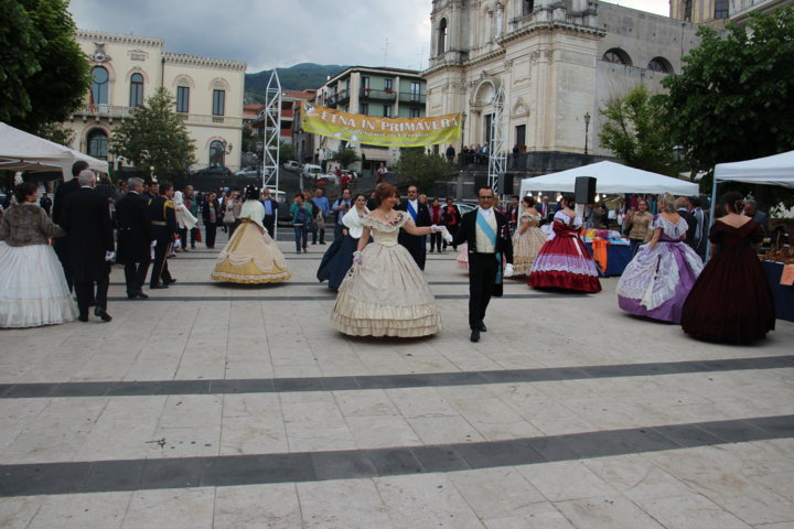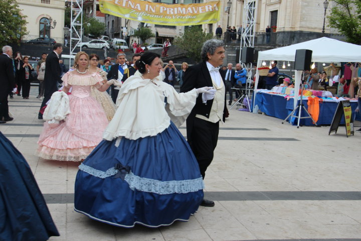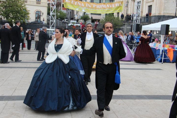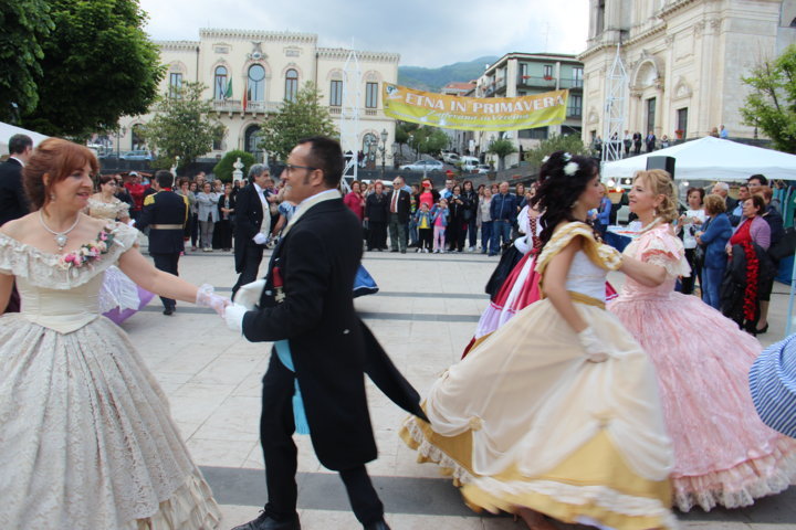 Michele La Rosa – Un pomeriggio diverso nel centro etneo, accompagnati da musiche e danze di altre epoche per Etna in Primavera. Sono stati i componenti di “Danzando l’Ottocento” a creare domenica pomeriggio le magiche atmosfere di un tempo, con i loro vestiti, le loro danze, le musiche. La location si è ben prestata per l’evento, dove il Municipio, la chiesa, le scale, hanno fatto da scenografia naturale alla piazza a belvedere sullo Ionio. E’ stato un tuffo nel passato, a quel clima sfarzoso di una cornice gattopardesca sempre interessante, affascinante. Il pubblico ha gradito l’occasione, facendosi trascinare in quelle danze d’altri tempi, per una Sicilia del passato ma sempre attuale. tra un giro negli stand e i balli dell’800 Zafferana ha vissuto un pomeriggio diverso rispetto ai tradizionali eventi di queste circostanze.