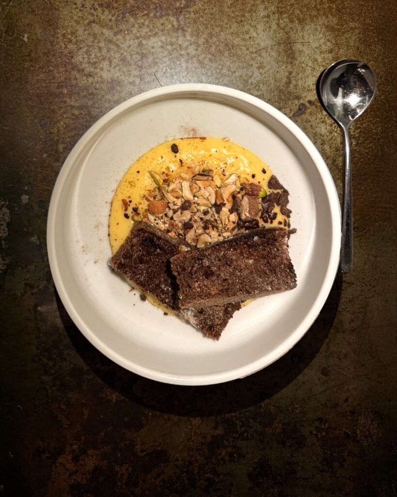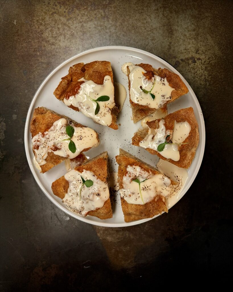 Interessante la piccola pizza con crema di mele, guancia di vitello e mosto cotto all’arancia, realizzata con farina di Maiorca: un impasto dal cornicione pronunciato che esprime la filosofia del pizzaiolo, mentre il topping è stato curato dallo chef. Il percorso si è concluso con una crema siciliana avvolgente, servita insieme a tranci di pane al cacao che richiamavano in chiave contemporanea la tradizione domestica del “pane e crema”, in un gioco di memoria e comfort. A chiudere l’esperienza, l’immancabile iris, dolce iconico della pasticceria siciliana, proposta in una versione elegante e fedele alla tradizione, firmata dallo chef Seby Sorbello, a suggello di un viaggio tra tecnica, identità e ricordo.